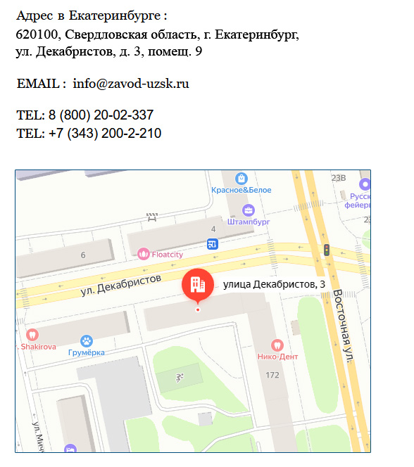 Наши контакты Информационно-сервисное представительствоАдрес: 610035, Россия, Киров, улица Сурикова, 11АE-Mail: kirov@zavod-uzsk.ruТелефон: Звонок по России бесплатный!Время работы:ПН — 09.00 — 20.00ВТ — 09.00 — 20.00СР — 09.00 — 20.00ЧТ — 09.00 — 20.00ПТ — 09.00 — 18.00СБ — выходнойВС — выходной